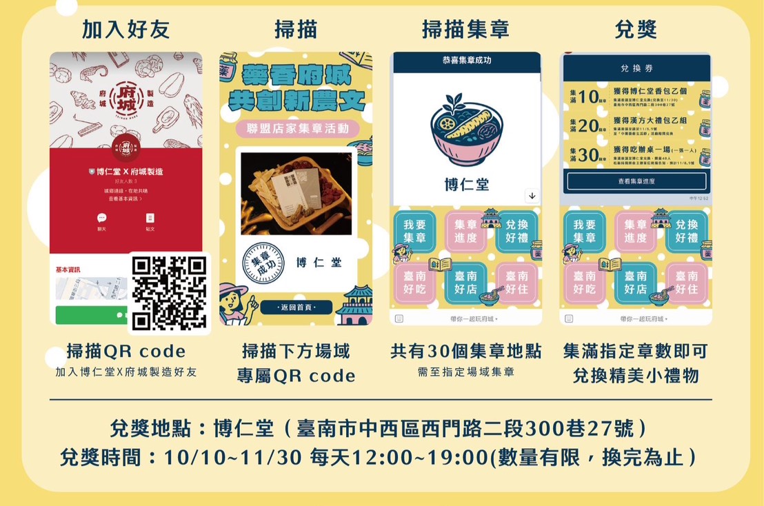 LINE電子集章活動推出豐富好禮:集滿10章可兌換「博仁堂香包乙個」;集滿20章贈「漢方大禮包乙組」(11月8日後開放兌換);而集滿30章的參與者更可獲得限量「藥膳辦桌」一席(一人份,限40名,贈完改贈漢方大禮包)。活動日期自10月7日至11月10日,兌獎地點為臺南中西區「博仁堂」(西門路二段300巷27號),兌獎時間為10月10日至11月30日,每日中午12點至晚上7點,數量有限、換完為止。