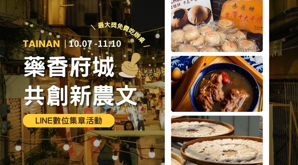 由中華民國全國中小企業總會輔導、博仁堂主辦的「藥香府城共創新農文」集章活動已開跑,從好吃美食、好逛名店到小型優質旅宿,邀請民眾走訪臺南在地店家,感受藥香與地方人文風情。活動串聯約31家聯盟店家,推出LINE電子集章活動,從10月7日至11月10日止,只要集滿指定章數,即可獲贈精美禮品,最大獎為價值千元的「享用藥膳辦桌一席」